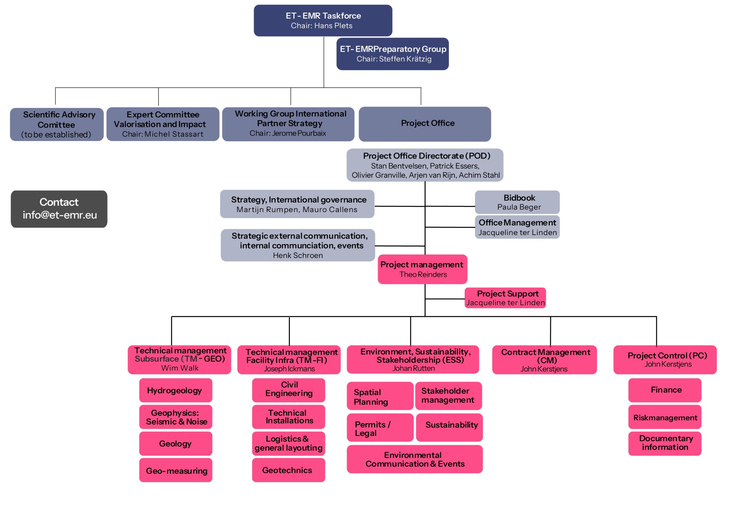 La Taskforce ET-EMR et le Preparatory Group sont des instances issues des partenaires gouvernementaux de l’Euregio Meuse-Rhin, qui surveillent les progrès de la phase de faisabilité, du dossier de candidature et de la stratégie internationale, et les pilotent au niveau administratif.